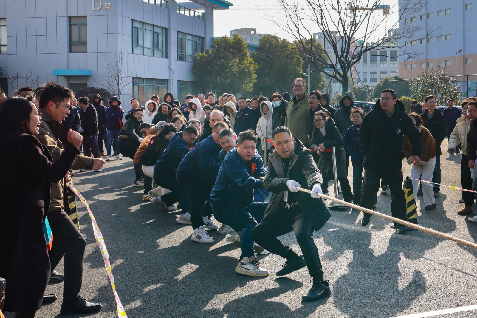 隨著裁判員的一聲清脆哨響,兩大園區的拔河比賽正式打響。參賽隊員們起繩、拉緊、挺身、開拔,瞬間的爆發力沖向云霄,各個憋的面紅耳赤,使出了渾身力氣,大家一起“一二一二”的喊著口號,卯足勁往一處使,將力量擰成一股繩,團結一致、頑強拼搏。場邊啦啦隊們也不甘示弱,吶喊聲、助威聲一波一波沖擊著賽場,氣氛熱烈愉悅。