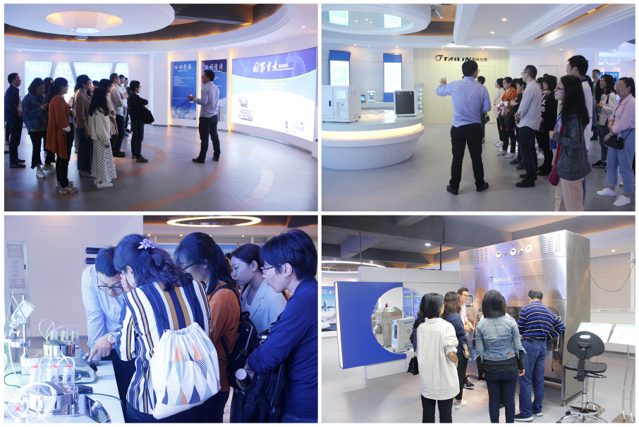 參觀一期新生產基地后,領導和專家們隨即參觀了泰林生物企業形象和產品展示廳,全面地了解了泰林生物的發展歷史、企業文化和核心產品,對無菌隔離器系統、過氧化氫滅菌器、無菌檢測系統、微生物檢測系統及TOC分析儀等產品產生了極大的興趣。參觀的同時也對產品的操作及性能特點展開了交流、討論,充分肯定了泰林生物的科研成果和技術水平。